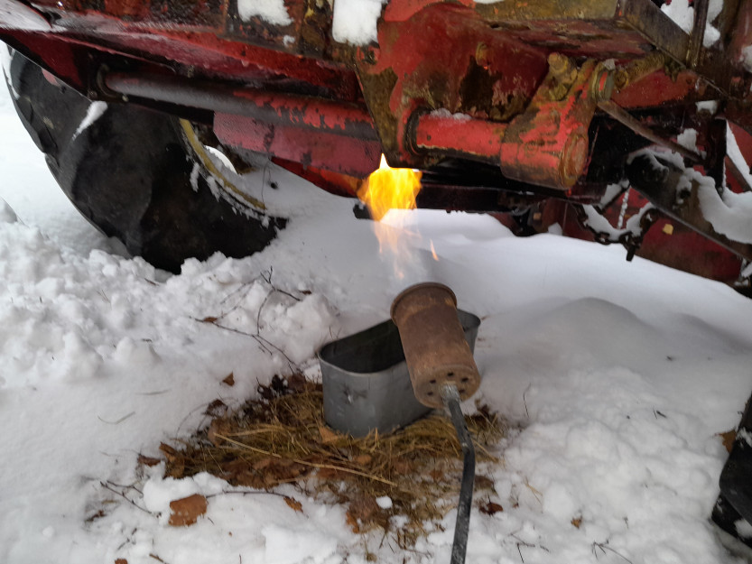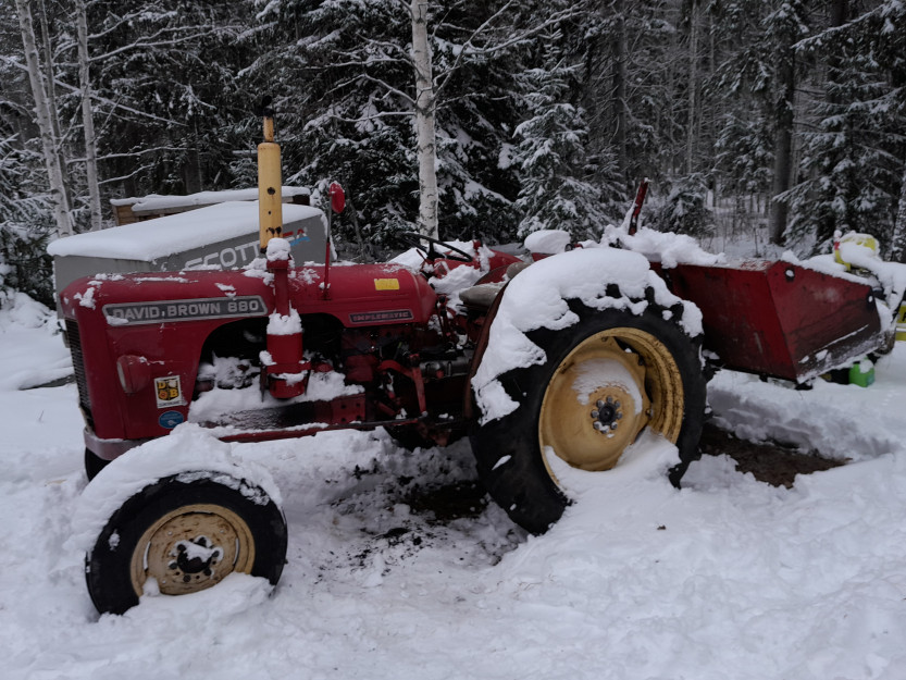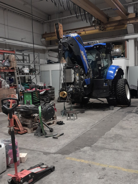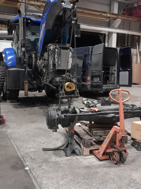 Talvitöinä jouduttiin koittamaan traktoritöitä. New Holland 170. Etukardaanin tuenta oli hajonnut uusittiin osat ja hyvä tuli. Nosturi pääsi oikeuksiinsa.
